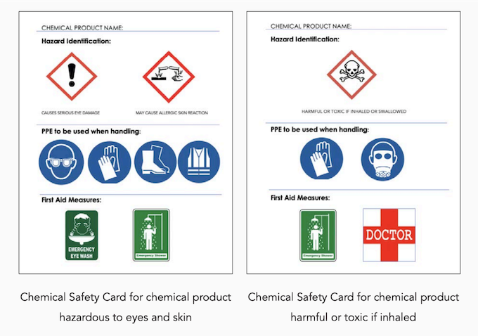 Important hazard information and first aid/emergency response measures can be conveyed to workers handling chemicals using pictorial signs for quick understanding by preparing “Chemical Safety Cards”. These cards can be kept near the storage area of the chemical for easy visibility to workers handling the chemical so that they can take necessary precautionary actions.
